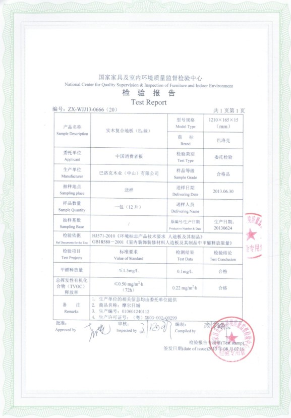 據悉 ,在CIDA中國綠色家居環境技術工作委員會、全國28省市消協(消委會、消保委)及中國消費者報共同發起的2013年地板與板材環保性能比較試驗活動中,被抽檢的“生活家·巴洛克實木復合地板”(摩爾日城系列,規格1210*165*15mm,生產日期2013.06.24),甲醛釋放量實測值為0.1mg/L(國標甲醛限值≤1.5mg/L,日本最高標準F4星≤0.3mg/L),優于國家GB18580-2001限量標準;TVOC釋放率為0.22mg/m2.h(72h),符合HJ571-2010限量標準。