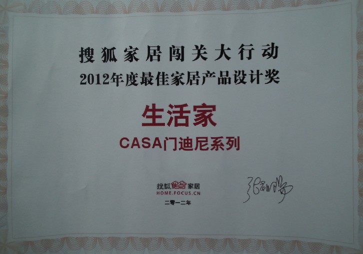 (生活家·CASA門迪尼系列榮獲2012年度最佳家居產品設計獎)