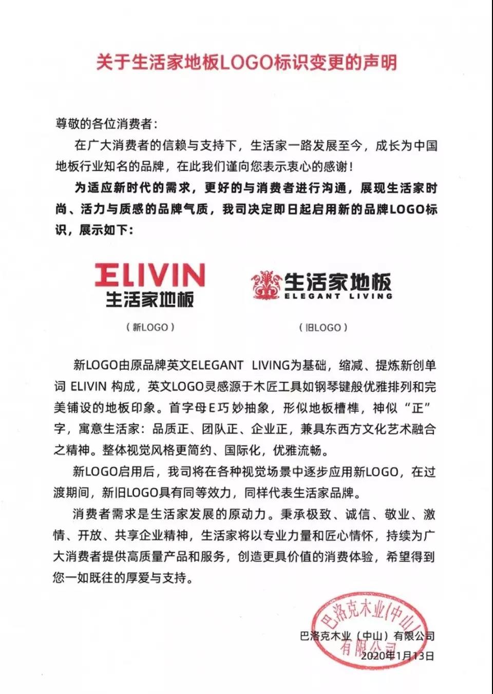 新LOGO由原品牌英文ELEGANT LIVING為基礎,縮減、提煉新創單詞 ELIVIN 構成,英文LOGO靈感源于木匠工具如鋼琴鍵般優雅排列和完美鋪設的地板印象。首字母 E 巧妙抽象,形似地板槽榫,神似“正” 字,寓意生活家:品質正、團隊正、企業正,兼具東西方文化藝術融合之精神。整體視覺風格更簡約、國際化,優雅流暢。新LOGO啟用后,我司將在各種視覺場景中逐步應用新LOGO,在過渡期間,新舊LOGO具有同等效力,同樣代表生活家品牌。消費者需求是生活家發展的原動力。秉承極致、誠信、敬業、激情、開放、共享企業精神,生活家將以專業力量和匠心情懷,持續為廣大消費者提供高質量產品和服務,創造更具價值的消費體驗,希望得到您一如既往的厚愛與支持。
