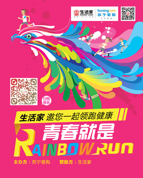 9月27日開始,由蘇寧易購組織,生活家贊助的彩虹跑活動將分別在武漢、昆明、合肥三大城市進行。與傳統的跑步活動不同,在生活家彩虹跑活動中,跑者得到的是一種前所未有的跑步體驗。距離為5公里的彩虹跑沒有計時器,跑者每一公里都將經過一個色彩站,從頭到腳都會被拋灑上不同的顏色,到達終點時每個人都會像調色板一樣色彩繽紛!