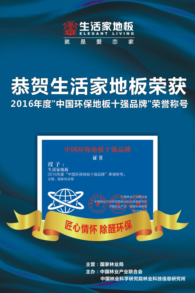 近日,生活家地板再一次獲得由國家林業(yè)局主管,中國林業(yè)產(chǎn)業(yè)聯(lián)合會、中國林業(yè)科學(xué)研究院林業(yè)科技信息研究所頒發(fā)的2016年度“中國環(huán)保地板十強品牌”。