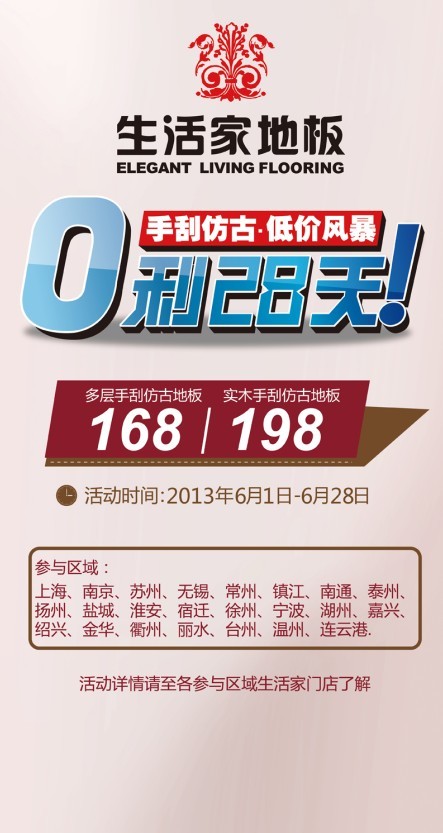6月1日-6月28日,生活家地板華東區(qū)域年中大促火熱來襲!手工地板掀起低價風(fēng)暴,數(shù)百款精品給你好看!活動現(xiàn)正火熱進(jìn)行中......