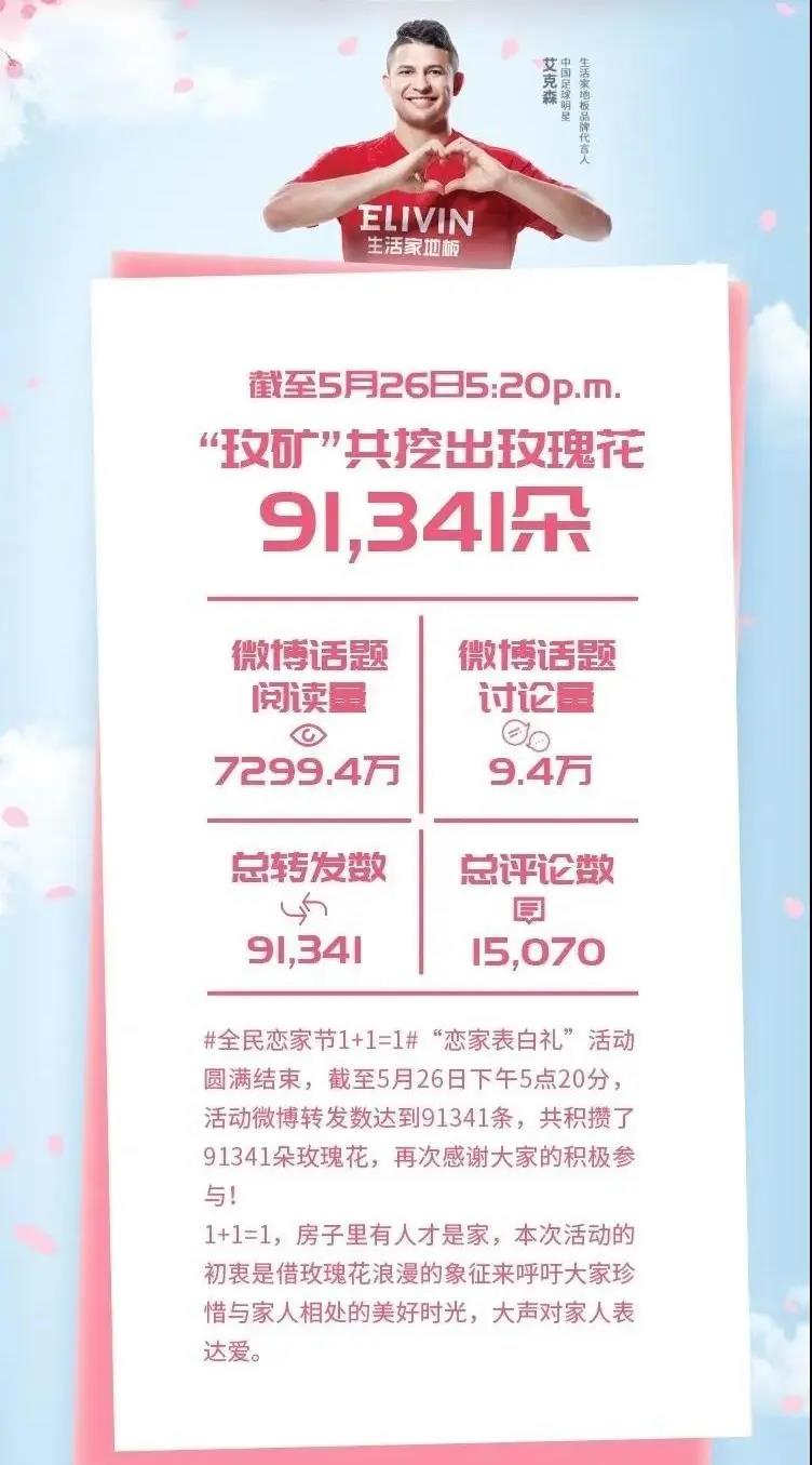 5月20日,生活家借助520網絡情人節自帶流量的優勢,在微博發起“全民戀家節1+1=1”的活動,中國足球隊知名球星艾克森與王霜呼吁大家在向另一半表達愛的同時,不要忘記向家人表達愛意與感謝。生活家在官方微博掀起了一場“戀家表白禮”活動:轉發指定微博,就有機會獲得 “戀家表白禮”——抽取1位幸運兒送出玫瑰花,活動微博轉發多少次,就送多少枝玫瑰!在眾多大V和粉絲的轉發下,本次微博互動話題閱讀量高達7299.4萬,話題討論量達9.4萬,總轉發數91341。