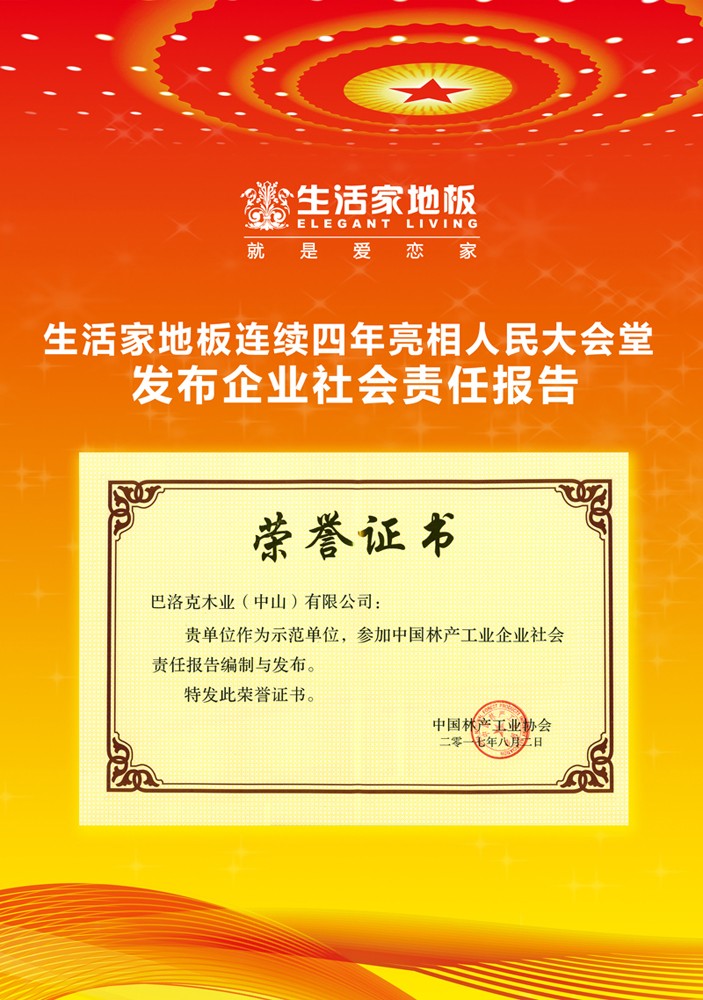 8月2日,《中國林產工業協會社會責任報告》在人民大會堂正式發布。生活家受邀參加了大會,與其他14家林產工業骨干企業聯袂發布了“企業社會責任報告”,并被授予中國林產工業企業社會責任報告編制與發布示范單位。這是生活家連續4年亮相人民大會堂發布企業社會責任報告